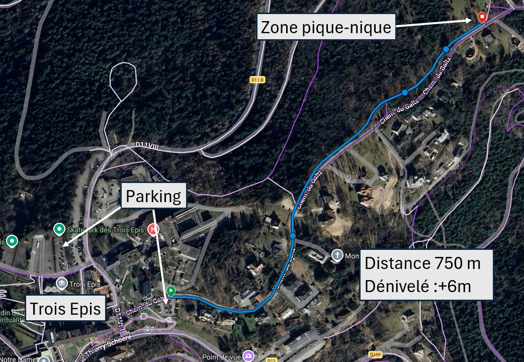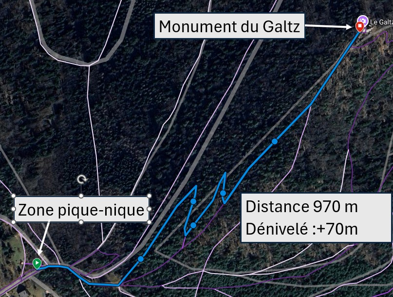 Pour ceux qui viennent en voiture, vous pouvez vous stationner aux Trois Epis 48.100272, 7.232111. De là il est facile de rejoindre le point de pique-nique (750 m). Arrivée prévisionnelle du groupe randonneur 12h30. Après la pause, il n’est pas très difficile d’atteindre le monument du Galtz.