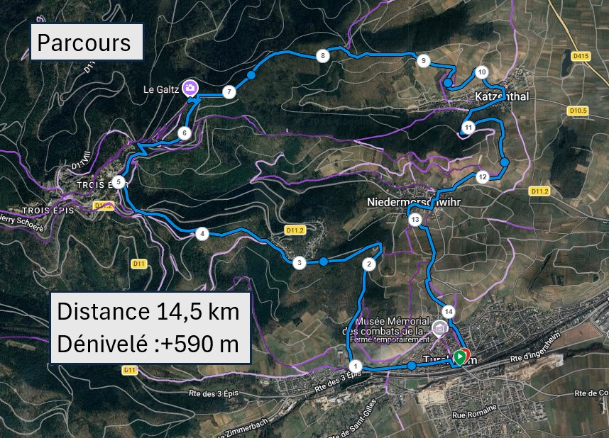 Parcours de moyenne montagne en foret dans une grande partie puis à partir de Katzenthal sur des chemin de vignes.
